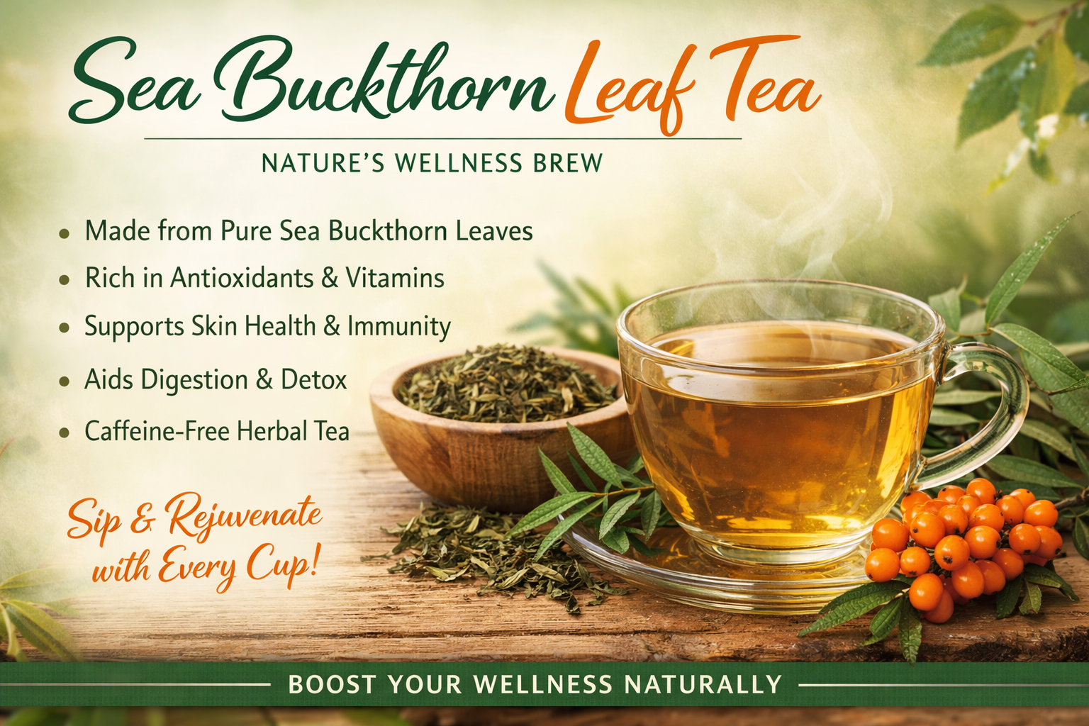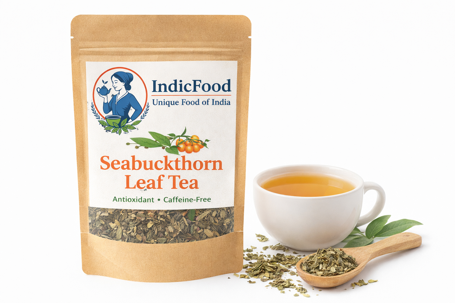 IndicFood Seabuckthorn Leaf Tea is a premium herbal infusion made from carefully selected leaves of the seabuckthorn plant (Hippophae rhamnoides), traditionally grown in the pristine Himalayan region. Known for its rich nutritional profile, seabuckthorn leaves are valued for their natural antioxidants and wellness-supporting properties.Unlike regular tea, seabuckthorn leaf tea is naturally caffeine-free, making it a perfect choice for daily consumption—morning or evening.Benefit's of Seabuckthorn Leaf Tea - Rich in natural antioxidants, Contains Vitamin C, E & beneficial plant compounds, Supports immunity and overall wellness, Naturally caffeine free herbal infusion, Gentle on the stomach & refreshing in taste.