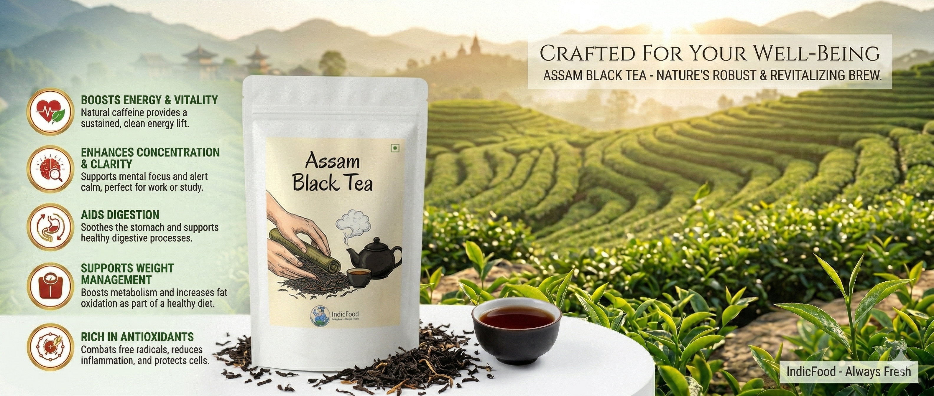 IndicFood’s 2025 Assam Black Tea is a bold and classic brew made from robust, hand-picked tea leaves sourced from the rich, fertile gardens of Assam. Known for its strong, malty flavor and deep amber liquor, this tea offers a full-bodied and invigorating taste that tea lovers cherish. Perfect for traditional morning routines or as an energizing afternoon cup, Assam Black Tea is naturally rich in antioxidants and delivers a brisk, satisfying finish. Enjoy it plain, with milk and sugar, or as your favorite chai blend. Authentic. Bold. Timeless — the true spirit of IndicFood Assam Black Tea.