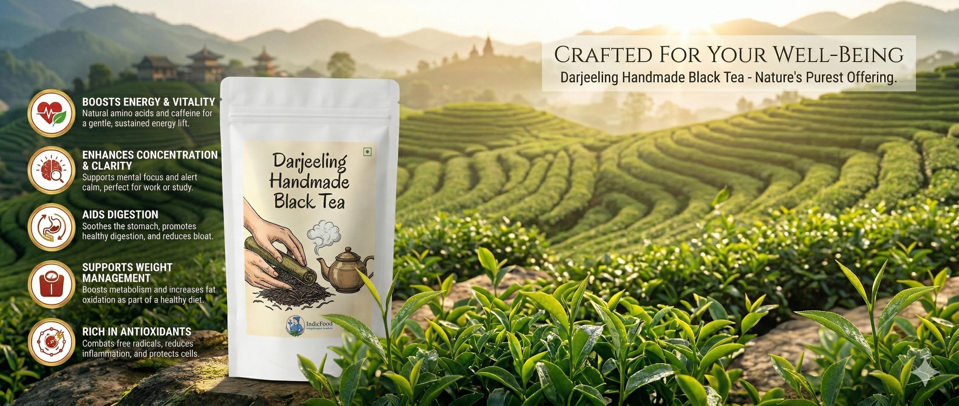 Darjeeling Handmade Black Tea Crafted in the misty hills of Darjeeling, IndicFood’s Handmade Black Tea is a tribute to tradition and artistry. Carefully plucked from premium tea gardens, each leaf is hand-rolled by skilled artisans to preserve its natural character and enhance its delicate aroma. Unlike machine-processed teas, this handmade black tea offers a refined cup with bright liquor, floral notes, and a subtle muscatel sweetness that Darjeeling is globally celebrated for. Its smooth, layered flavor makes it perfect for mindful sipping—whether enjoyed plain or with a hint of honey. A true connoisseur’s choice, IndicFood Darjeeling Handmade Black Tea brings you authenticity, elegance, and the soul of the Himalayas in every cup.