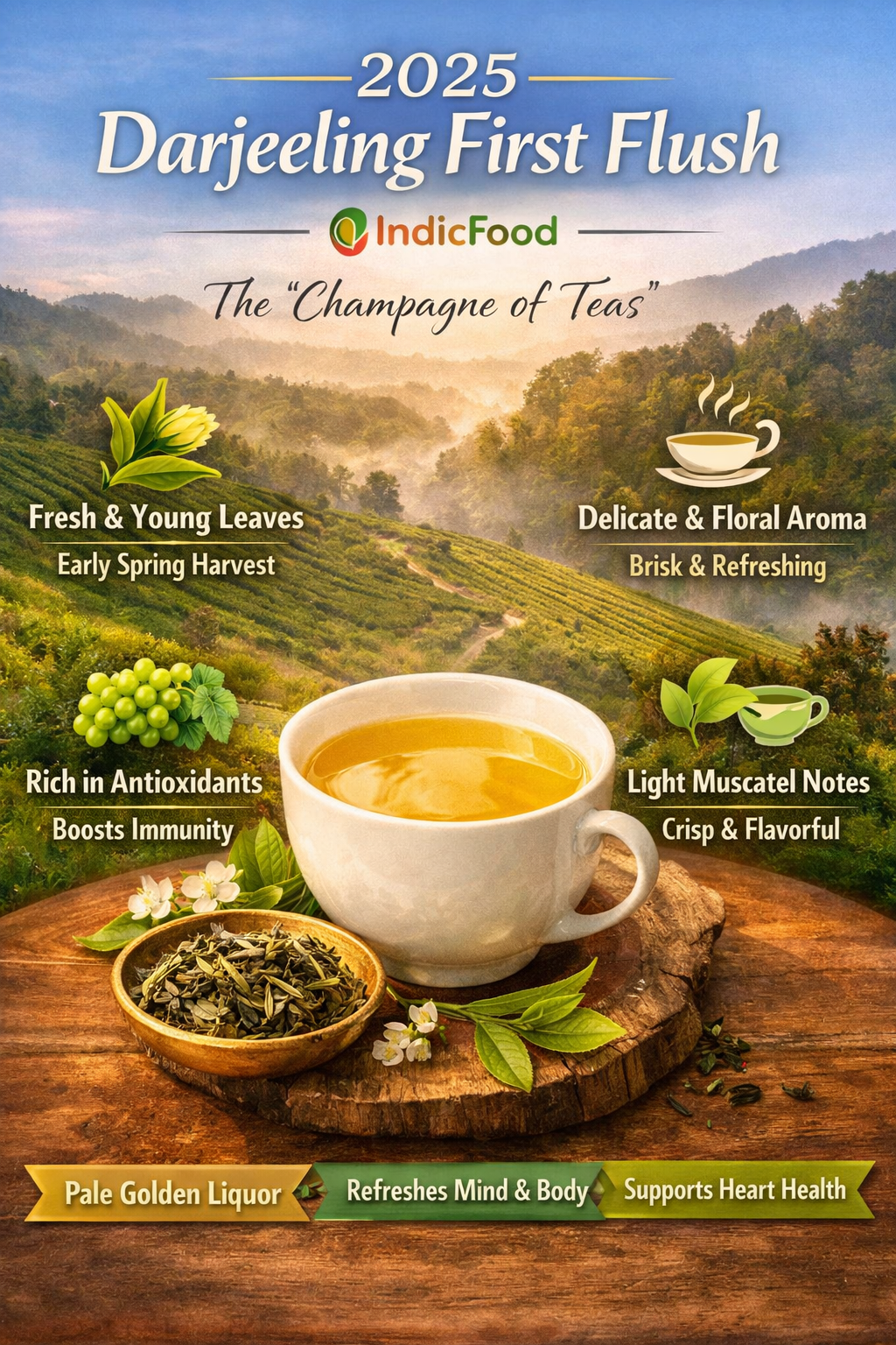 2025 Darjeeling First Flush harvested in the early spring of 2025 from the misty slopes of Darjeeling, IndicFood’s First Flush Tea is the season’s most prized and delicate offering. These tender young leaves, plucked at the start of the harvest, capture the freshness and vitality of the Himalayas. Lightly oxidized and carefully processed, this tea brews into a pale golden liquor with a crisp, floral aroma and a signature briskness. Notes of fresh greens, mild sweetness, and a hint of muscatel create a lively and refreshing cup. Celebrated as the “Champagne of Teas,” IndicFood 2025 Darjeeling First Flush is perfect for those who appreciate rare, seasonal teas with exceptional finesse and character.