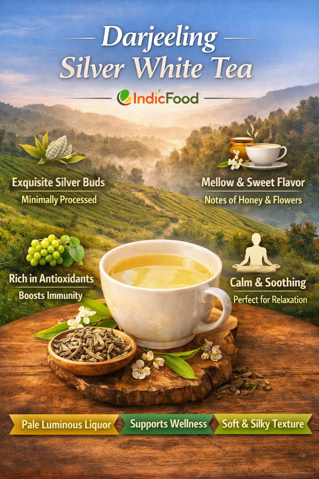 Darjeeling Silver White Tea –Sourced from the serene high-altitude gardens of Darjeeling, IndicFood’s Silver White Tea is one of the rarest and most delicate teas. Made exclusively from tender unopened buds covered in fine silvery hairs, it is minimally processed to preserve its natural purity and nutrients. This exquisite tea brews into a pale, luminous liquor with a soft, smooth texture and subtle notes of honey, fresh flowers, and a gentle sweetness. Its light and refreshing character makes it perfect for those seeking a calm and refined tea experience. Rich in natural antioxidants and crafted with utmost care, IndicFood Darjeeling Silver White Tea offers a luxurious, soothing cup that embodies elegance and wellness in every sip.